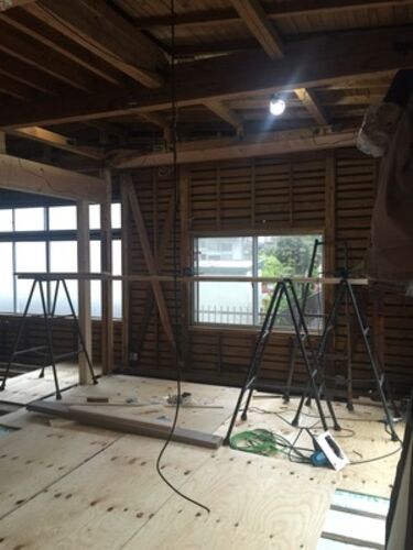 内部解体が完了し、床断熱材入を行い 大工さん作業がこれから佳境に(^^) 今日の様な天気が続くといいね^o^